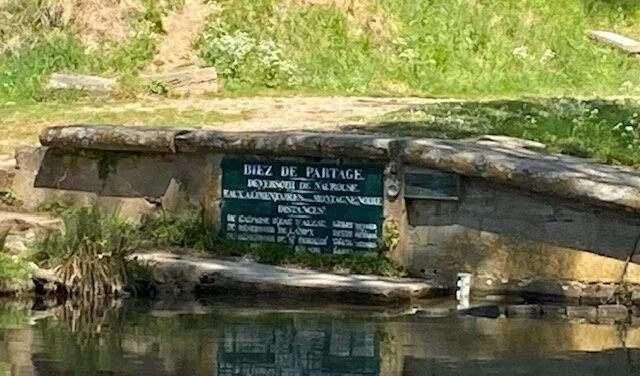Depuis Toulouse, notre routine aux écluses a changé, passant de la montée à la descente. Maintenant, nous descendons avec le courant. Nous découvrons ainsi au hameau de Naurouze, la démarcation indiquant la ligne de partage des eaux entre l'océan Atlantique et la Méditerranée. Nous passons la nuit dans ce mouillage ressemblant à un parc, profitant de l'occasion pour visiter les monuments qui honorent cet exploit d'ingénierie.