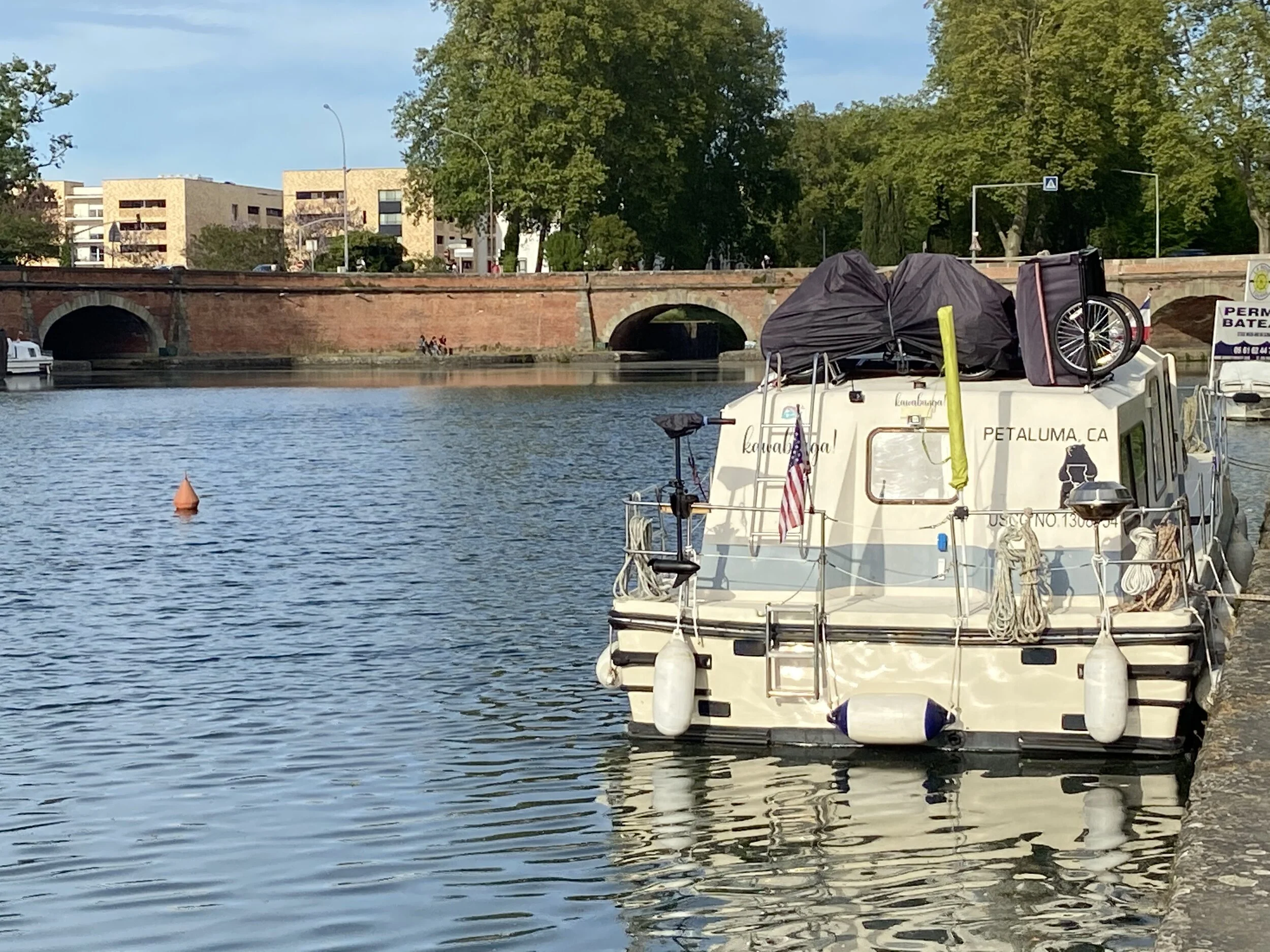 There is an upside to the current pandemic situation: France is hungry for tourists! We are the only boat circulating right now in this area, and while a bit sad and lonely, it certainly is bringing out the best in the French canal authority operations, the VNF (Voies Navigable de France) and port captain offices. Although we are allowed to navigate, “Covid oblige” we must check in with the VNF with our planned itinerary. They call us to make sure everything is A-OK, they give us personal cell numbers in case we need anything, and sometimes they even follow along the canal road with us to make sure the locks are working properly. The welcome we’ve had in the ports of Moissac, Castelsarrasin, Montauban, and now Toulouse have been overwhelmingly thorough, warm, friendly, and extremely helpful. I think they are all so bored thus glad to see us! The two sides of COVID on the canal.